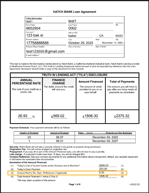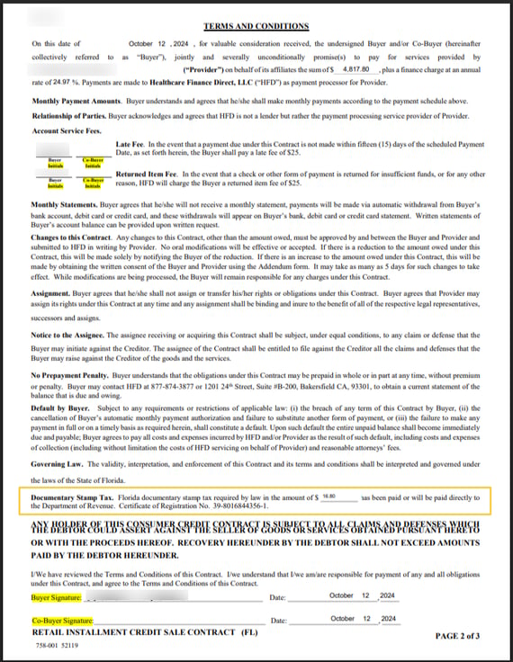 Only providers who generate Retail Installment Contracts (RIC) within the state of Florida are required to file and remit the documentary stamp tax. This tax is included in the patient’s principal balance as part of their retail installment agreement. Providers utilizing the Bank Loan program are not responsible for filing or remitting the tax; however, the patient remains responsible for payment, and the tax amount will be added to their loan agreement. The tax calculates to be $0.35 for every $100 financed.