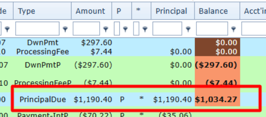 - Totals shown in the Principal and Amount columns confirm that a payment has been successfully processed. The Amount column reflects the full payment amount, while the Principal column shows how much of that payment was applied to the PrincipalDue..