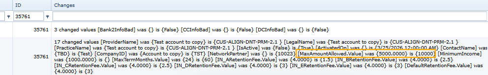 - Once search parameters have been set, view the results in the Changes column. Inspect the before/after values (ProviderName, bank fields, retention fees, etc.) to understand exactly what changed.